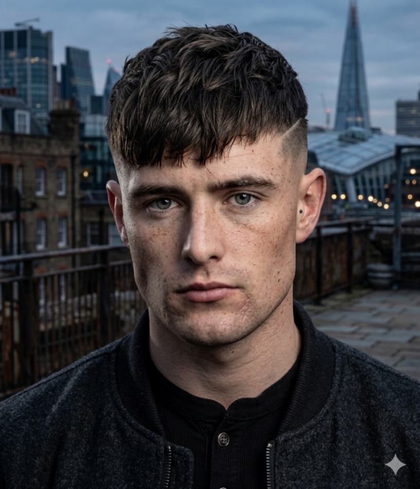 This is a shorter version of the textured crop. It’s sharp and urban. The small fringe breaks up the forehead without needing any real styling time in the morning.