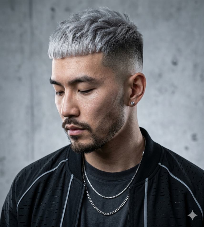 This cut uses a thick, straight-across fringe. The skin fade on the sides makes the hair on top pop. It’s a disciplined look for the modern man.