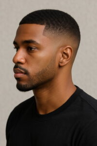 Tailored for modern taste, a low skin fade delivers both sharp lines and refined character. The barber starts the fade low, working around the sides and back, then blends it smoothly to bare skin. This style brings a clean, confident presence — especially suited for Black men who want their look to speak for itself. Short hairstyles for Black men pair easily with this type of faded haircut, highlighting natural texture while giving just the right touch of definition by the ear.