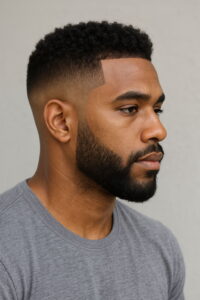 A short curly afro never fails to turn heads, especially for Black men seeking a sharp, modern look with texture. Pair it with a low fade and you get a striking contrast that sets the style apart. The skin fade creates a clean division between hair and beard, while thick, defined curls on top offer character. A full, shaped beard boosts the overall effect, adding just enough attitude.
