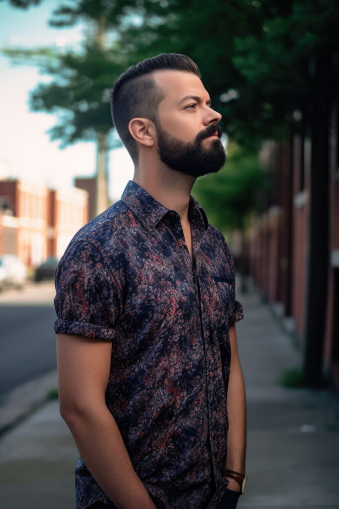 A faux hawk with shaved sides adds attitude without going over the top. The sharp shift between long and short creates a bold, clean profile. This high contrast men’s haircut makes the top look taller. Add a full beard with a tall hairstyle to ground the look — rugged on the bottom, sleek up top. The combo speaks loud without saying much.