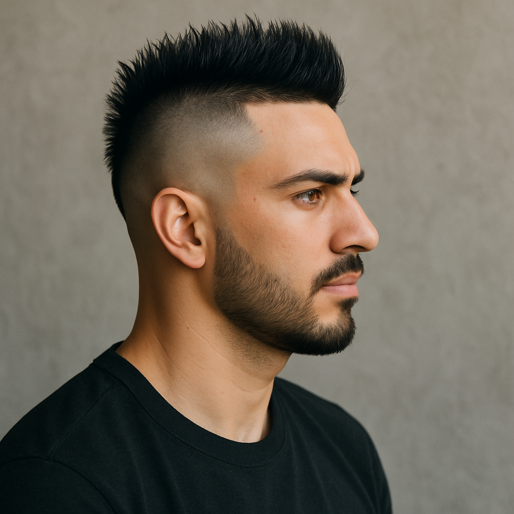 A modern mohawk fade for men offers sharp contrast with minimal styling time. The burst fade haircut style curves around the ear, keeping edges tight. Up top, the length adds drama — messy or slick, it works either way. Add a textured mohawk with a beard and the look shifts from clean to bold in seconds. It’s loud, stylish, and always on-point.