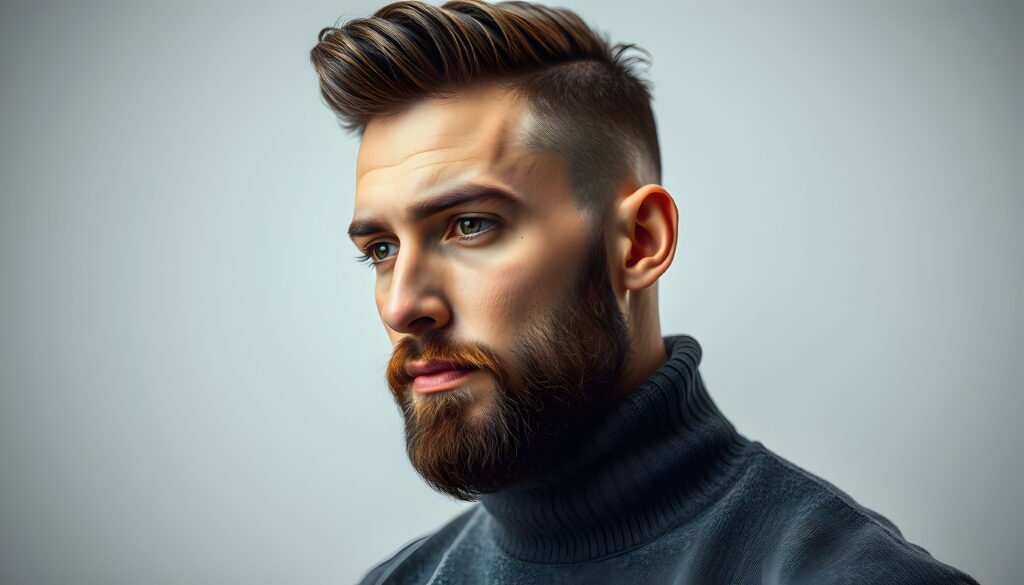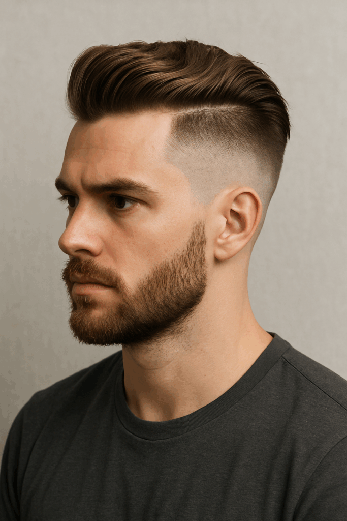 This modern quiff hairstyle offers a rugged yet refined vibe. Its longer top layers soften facial lines, while a tapered haircut for men on the sides creates sleek contrast. Paired with one of the best beard styles for rugged look, this combo blends masculine charm with minimal upkeep — perfect for those who want effortless impact without high maintenance.