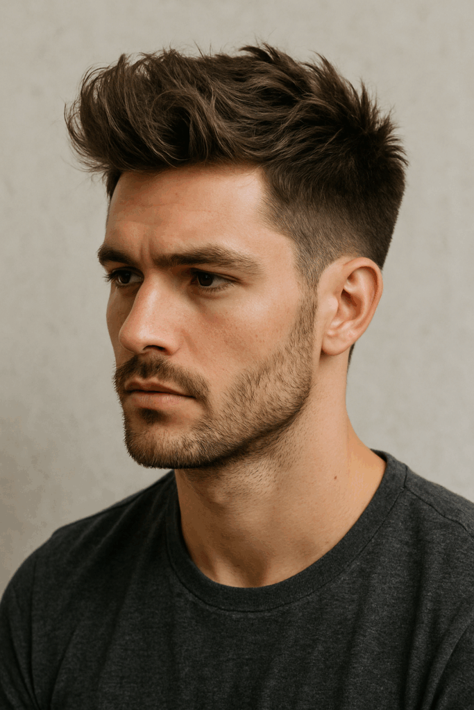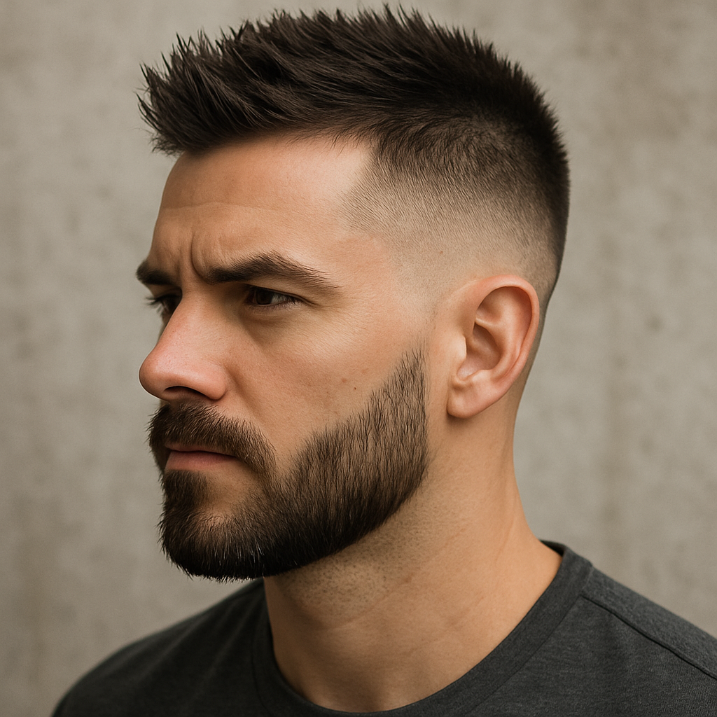 Short, spiky hair with a fade grabs attention without trying too hard. Sharp tips at the crown push upward, slightly messy yet sculpted, giving movement and attitude. The sides drop smoothly with a clean fade, pulling everything tight around the ears. A short, neat beard grounds the look. No fluff, just a bold, stylish cut that looks like effort but feels effortless.