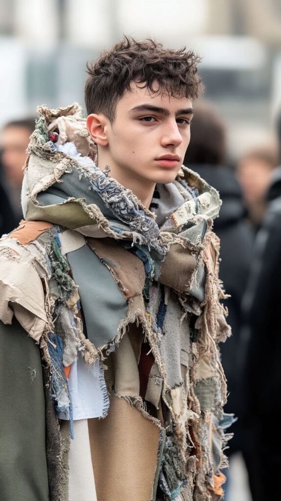 The messy shag haircut for men brings laid-back energy with thick layers and movement. A wavy fringe hairstyle sweeps across the forehead, adding character and depth. Textured men’s haircuts with sea salt spray are easy to style — just spray, tousle with your fingers, and let the natural waves fall into place for a loose, relaxed finish.