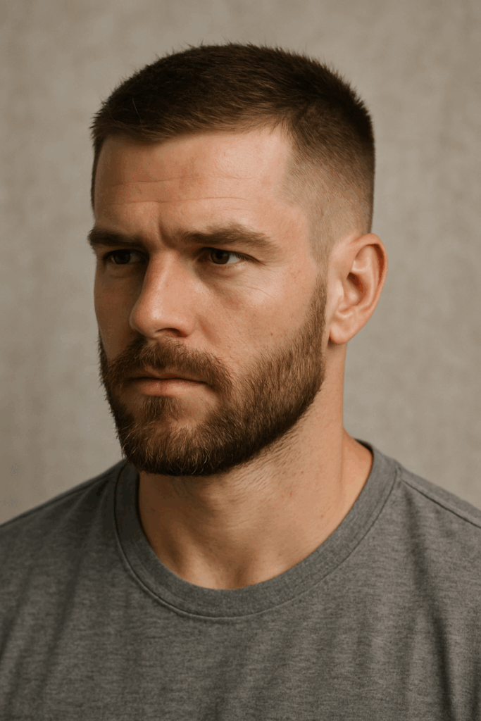 A butch cut fade keeps things minimal but far from boring. It’s sharp, clean, and suits guys who’d rather spend mornings doing anything but styling their hair. The short fade gives the sides a tight finish, and when paired with a line up haircut, the overall result looks extra polished. Add a beard fade if you want contrast — it builds just enough edge without adding effort.